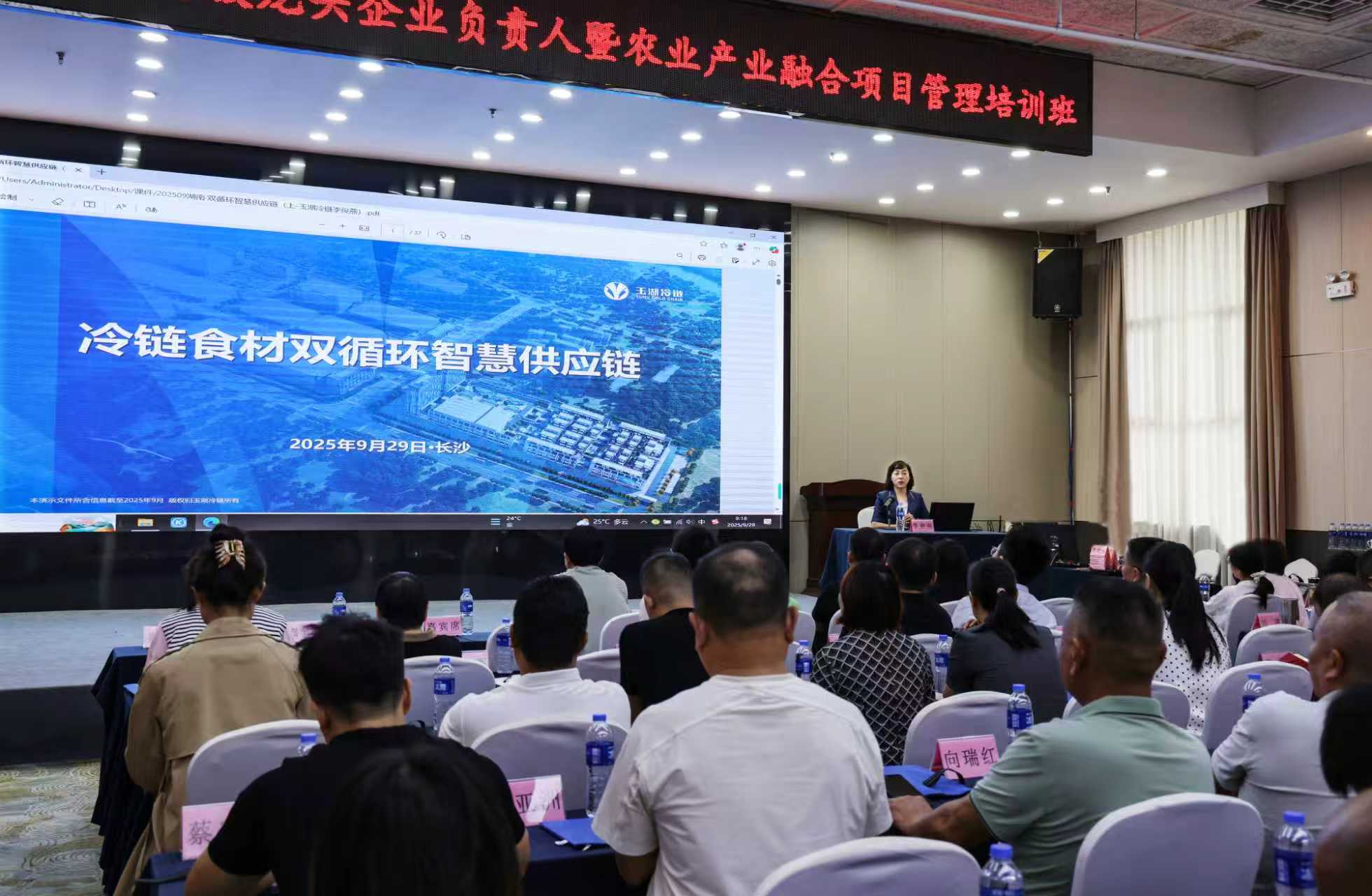 2025年9月28-30日,湖南省农业产业化省级龙头企业负责人培训班在长沙举行,省农业农村厅党组成员、副厅长祝云武出席开班仪式并讲话。本次培训邀请来自企业、高校的行业专家围绕农业经济及外贸出口形势、农产品加工科技创新展望、农业品牌建设、金融赋能产业政策解读、农业产业融合项目管理等作专题授课。玉湖集团执行董事黄铮洪,玉湖冷链董事、高级副总裁李俊燕受邀担任培训讲师,以“冷链食材双循环智慧供应链”为核心,为湖南农业龙头企业带来全链条双循环解决方案与实战经验分享。