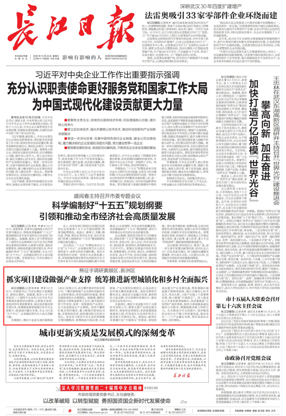 长江日报12月22日头版报道武汉市市委副书记、代市长熊征宇赴玉湖冷链(武汉)交易中心调研,了解冷链物流产业发展,要求坚持不懈抓好重点项目建设,着力做强空铁枢纽功能,发展枢纽经济,为全力打造“五个中心”、全面建设现代化大武汉贡献力量。