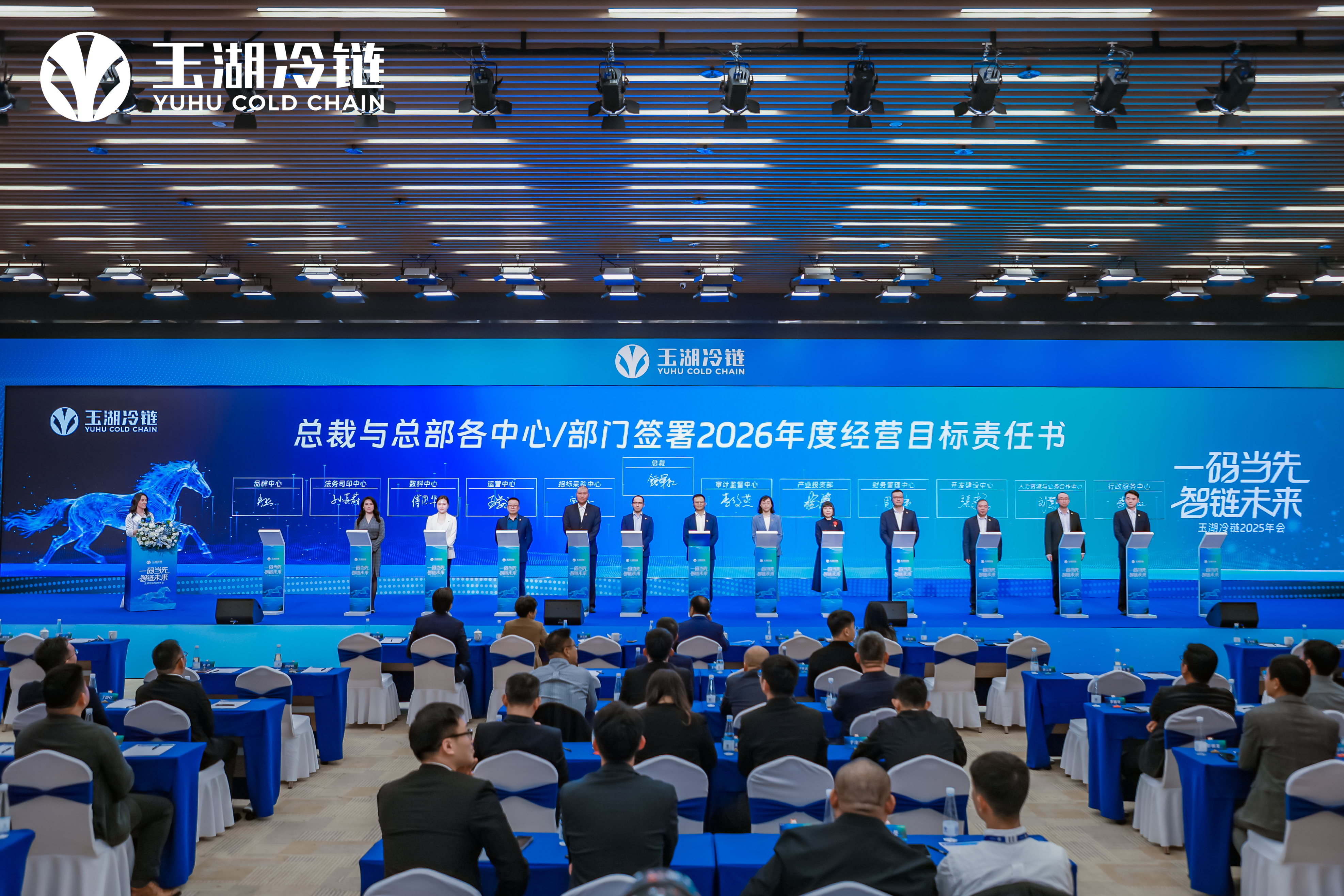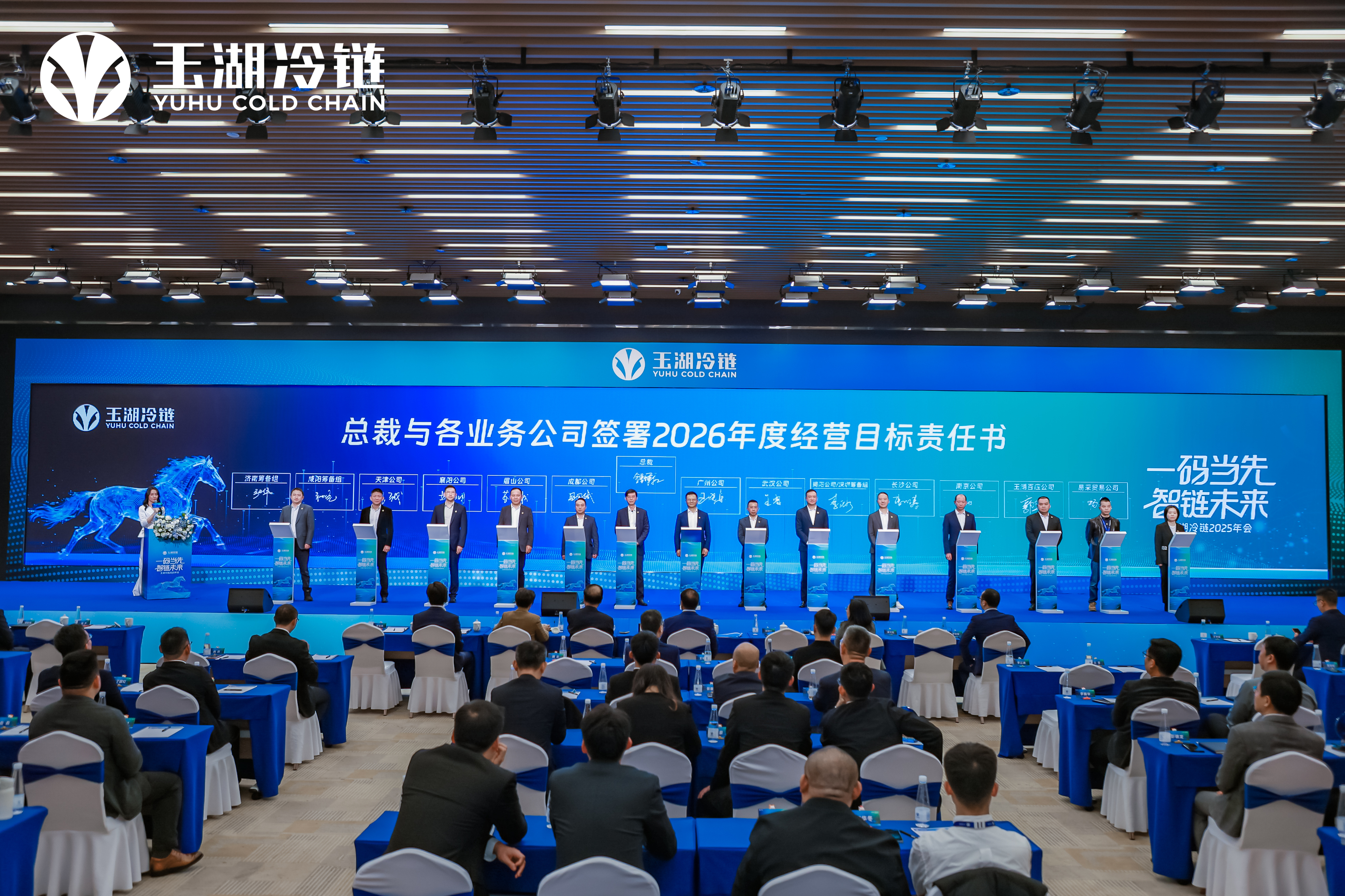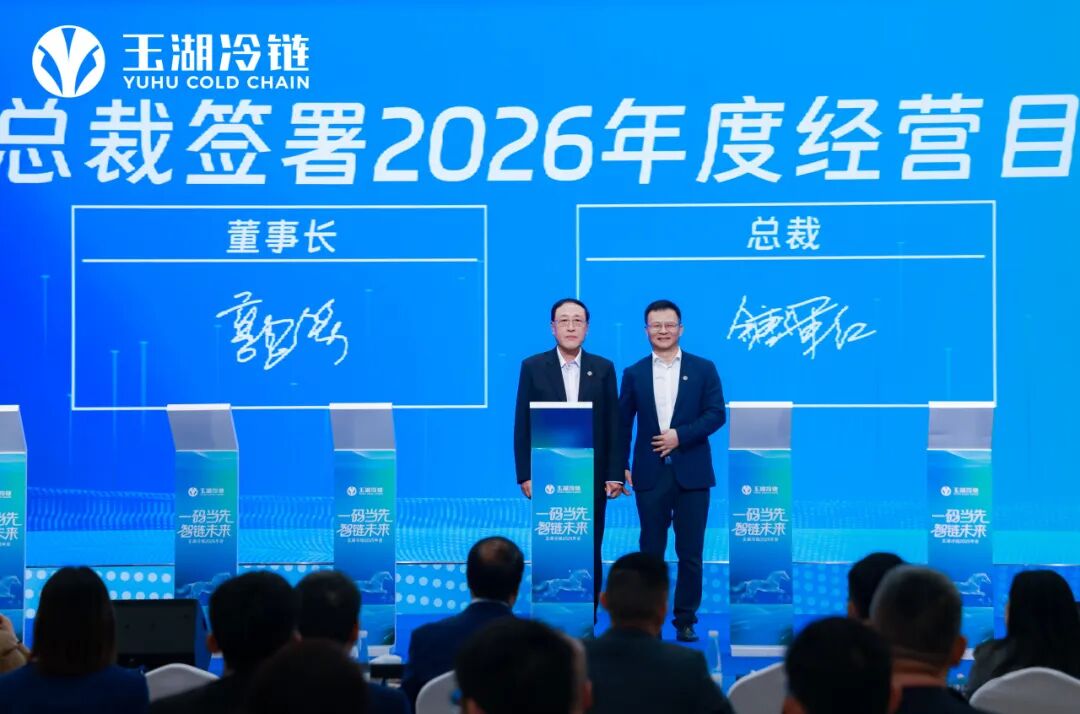 在年会上,玉湖冷链董事长代表董事会与总裁签订了2026年度经营目标责任书,总裁与各园区公司总经理、各职能部门负责人签订了经营目标责任书,明确任务、压实责任,将战略分解为目标明确的可执行任务,全员目标清晰、责任到人、全力以赴。