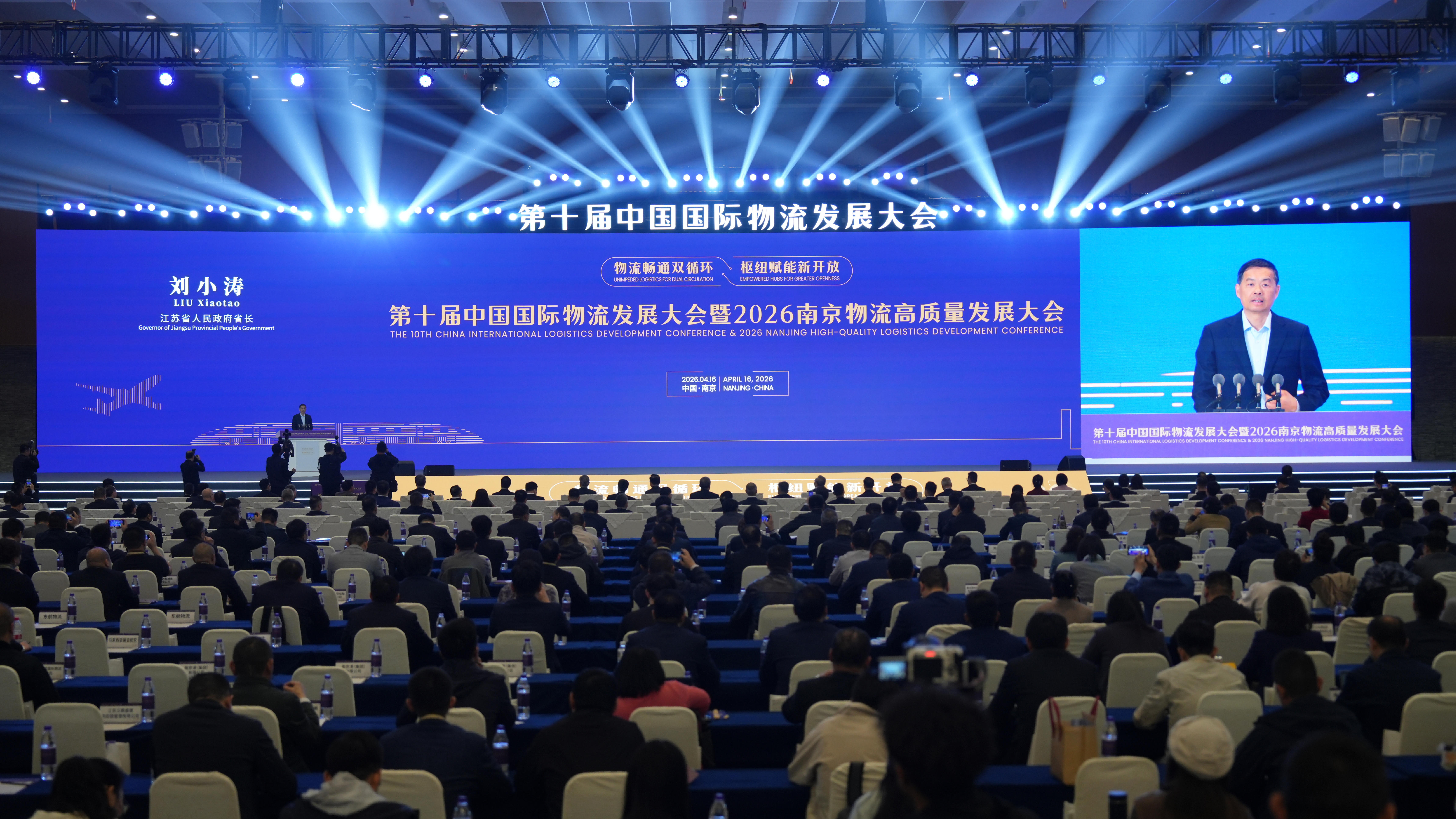 4月16日,以“物流畅通双循环 枢纽赋能新开放”为主题的第十届中国国际物流发展大会暨2026南京物流高质量发展大会在南京举行。江苏省省长刘小涛出席大会并发表讲话。江苏省委常委、南京市委书记周红波致欢迎辞,中国交通运输协会会长杨省世、中远海运集团董事长万敏、中国物流集团董事长刘敬桢分别致辞。