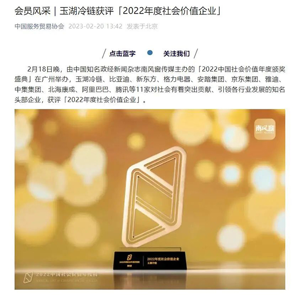 今年2月18日,「2022中国社会价值年度颁奖盛典」在广州举办,玉湖冷链获评「2022年度社会价值企业」,中国服务贸易协会全文转载了相关新闻(点击查看:会员风采|玉湖冷链获评「2022年度社会价值企业」)。