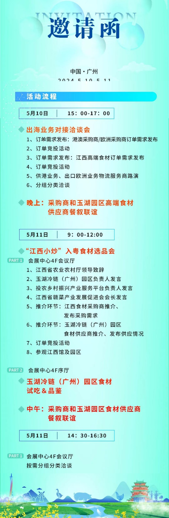 本次参会嘉宾来自玉湖冷链园区、投农业乡村振兴产业服务平台,江西省赣菜产业发展促进会、广东省江西商会、花都区餐饮协会等团体以及江西主要冻品交易市场和供应链企业,活动将包括“江西小炒”高端优质食材定点采购基地授牌仪式、江西食材采购商推介会、园区食材供应商推介会等重磅环节,诚邀粤赣粤两地重要采购商、经销商、供应商等参会交流。