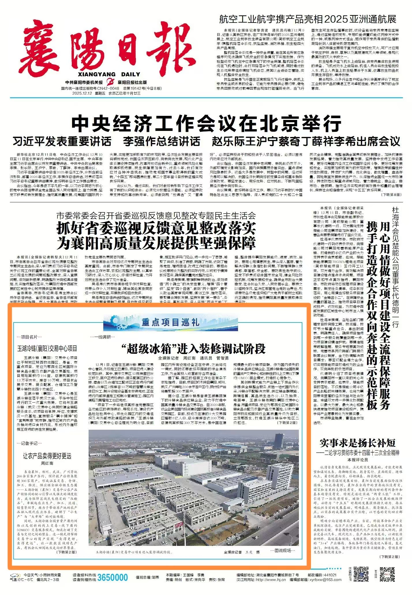 襄阳日报12月12日头版报道,玉湖冷链(襄阳)交易中心项目的最新进展。作为省、市重点建设项目,该中心自去年3月拿地以来进展迅速,目前各功能区主体已全面竣工,正式进入建设收尾与运营筹备阶段。以下是报道全文: