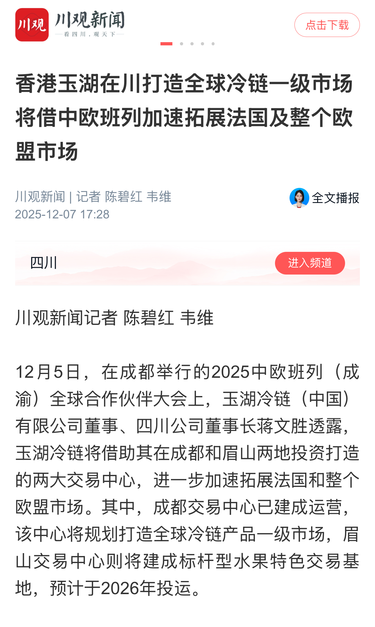 四川日报(川观新闻)报道称,近年来,中法交往密切,经贸合作持续深化,特别随着四川扩大高水平对外开放能级加速提升,这让玉湖冷链看到了未来发展更多机遇。未来玉湖冷链将进一步通过中欧班列衔接法国及欧盟市场,构建“从法国农场到中国餐桌”与“中国地标到欧洲商超”的双向供应链通道。同时,还将在冷链国际标准制定方面加强与法国等欧洲国家合作,填补全球冷链物流细分领域标准空白。