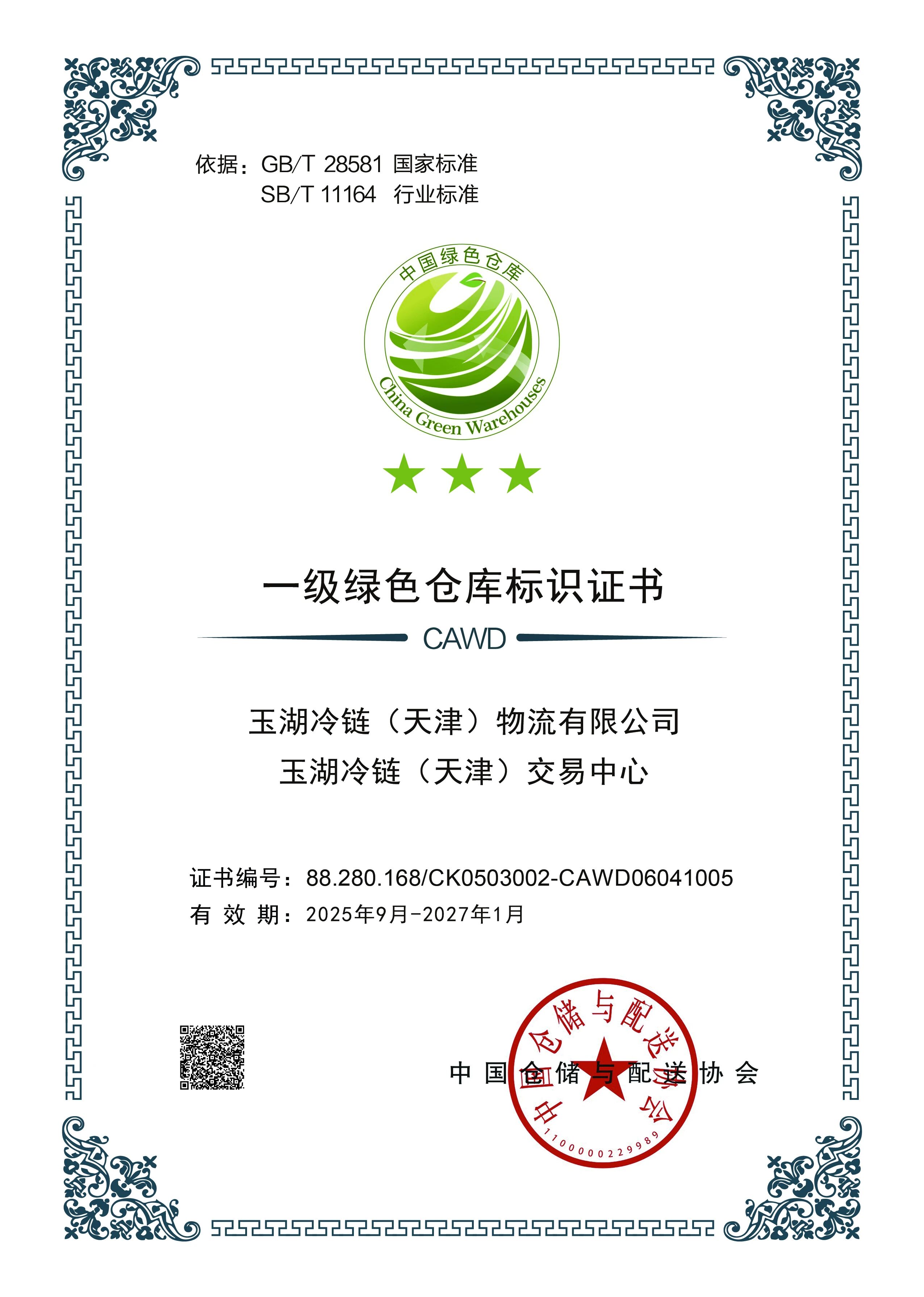 第8个“绿仓”!玉湖冷链(天津)交易中心获“国家一级(三星)绿色仓库”认证
